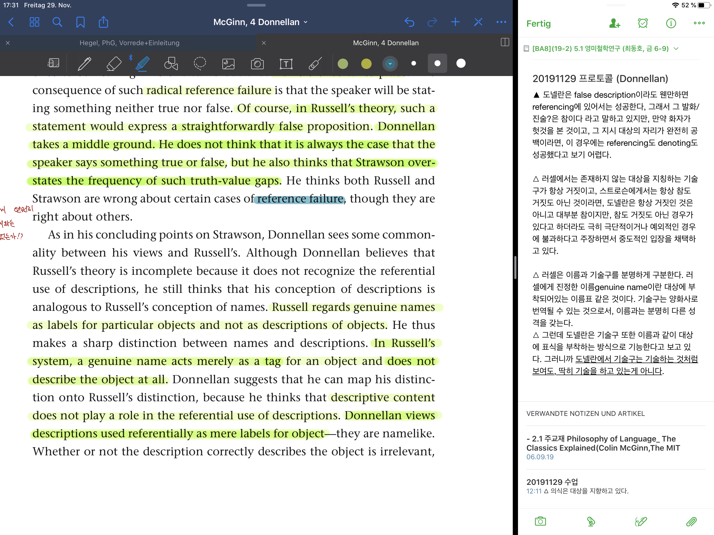 우선은 그렇게 여러 색깔을 칠하면서 읽는 동안 생각을 덜 하게 된다는 것이고 (특히 외국어로 읽는 경우에 의미를 제대로 이해하지 못했으면서도 대충 '중요한 문장인 것 같다, 흥미로운 내용인 것 같다, 나중에 다시 읽어봐야겠다, 전체를 요약하는 부분이네'라고 생각하면서 색깔만 입히고 넘어가는 경우가 많았다), 너무 지면이 요란해서 나중에 다시 읽기 싫어지거나, 다시 읽는다고 하더라도 기존에 분류해서 칠해놓은 색깔들이 딱히 독해에 도움이 되는 경우가 많지 않았다. 그래서 일단 텍스트를 여러 번 읽지 않으면 초독에서는 아무리 잔기술을 쓴다고 해도 내용을 제대로 파악하고 숙지할 수 없다는 것을 다시한번 깨달으면서, 이번에는 형형색색으로 지면을 채우려는 나태함을 떨쳐보려고 했다.