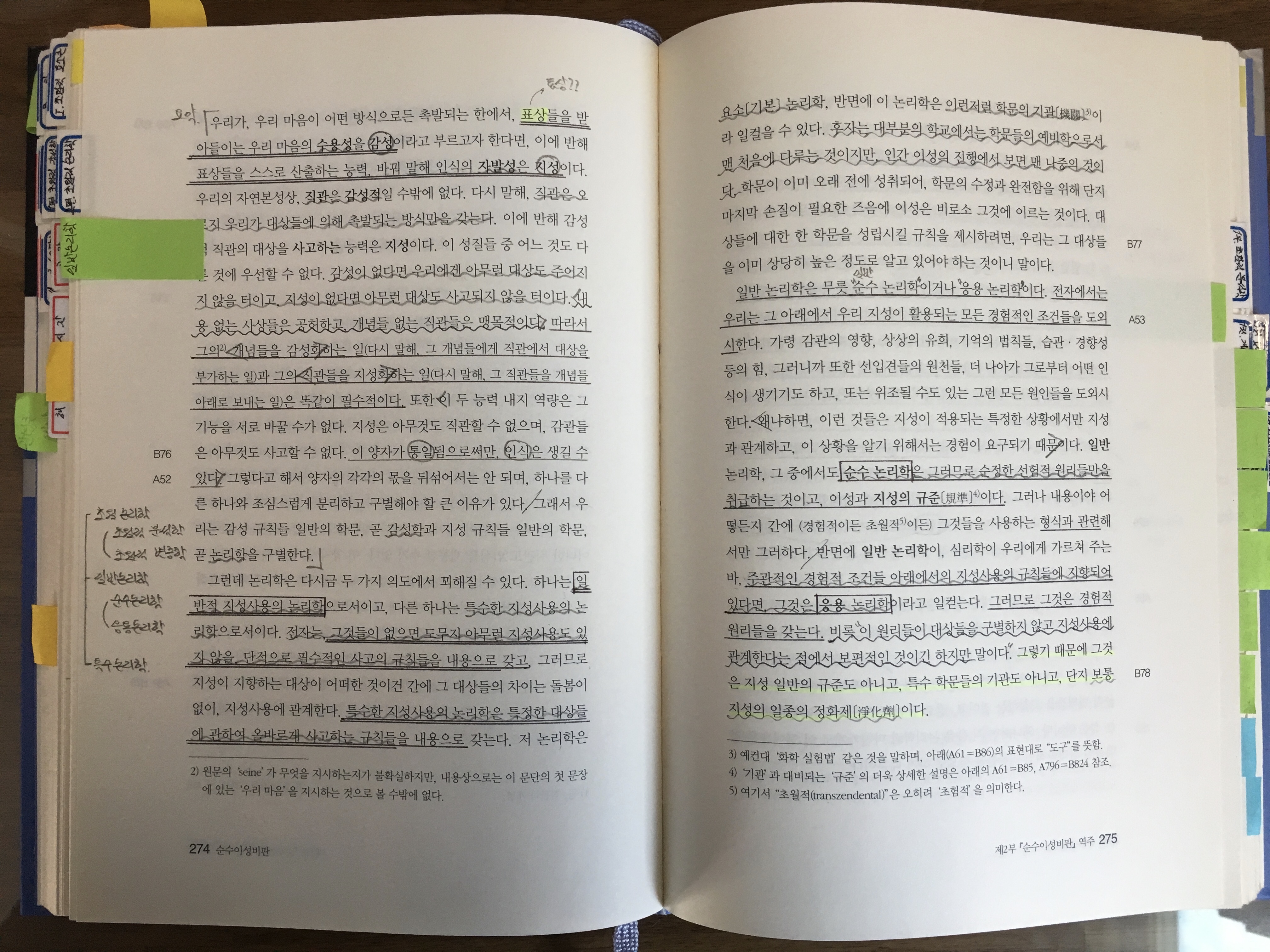 - 네 시간동안 칸트의 <순수이성비판> 초월적 논리학 앞부분 30페이지를 세 번에 나눠서 읽었다. 1회독을 하다가 중간에 길을 잃거나 맥락을 놓치면 다시 처음으로 돌아와서 볼펜으로 핵심들을 다시 짚어가면서 돌아왔다.