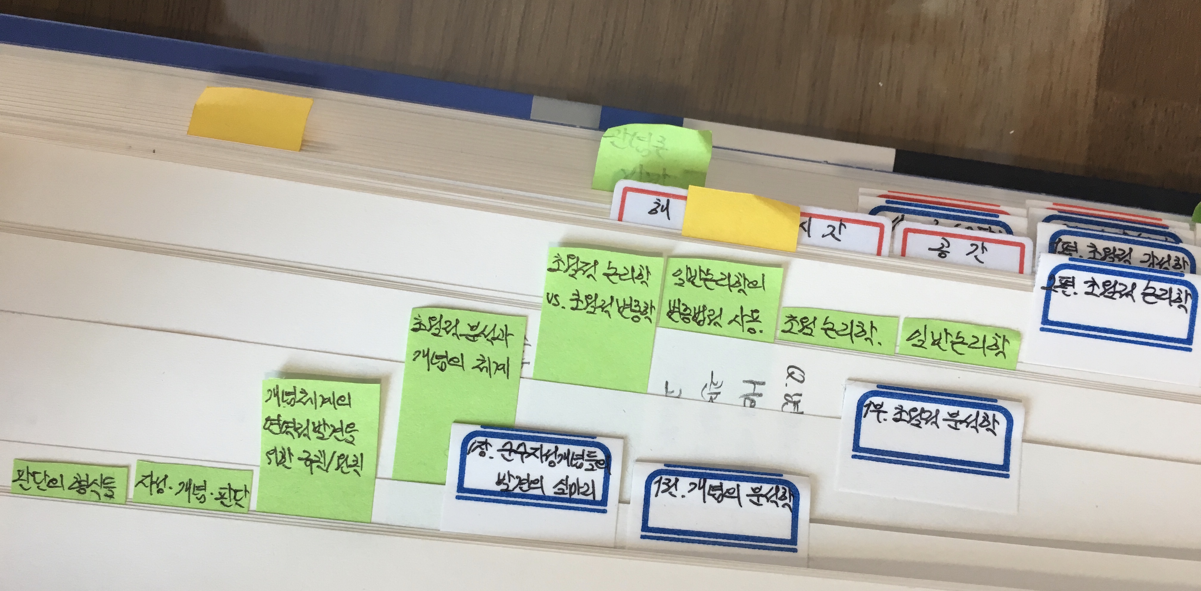 - 마지막으로는 각각의 소챕터들에서 중심적으로 다루고 있는 내용들을 포스트잇에 적어서 목차처럼 남겨두었다. 이렇게 하면 가장 원거리에서 맥락을 조망할 수 있는 것 같고, 심리적으로도 소유감이 들어서 허탈감을 조금은 방지해준다..ㅋㅋ