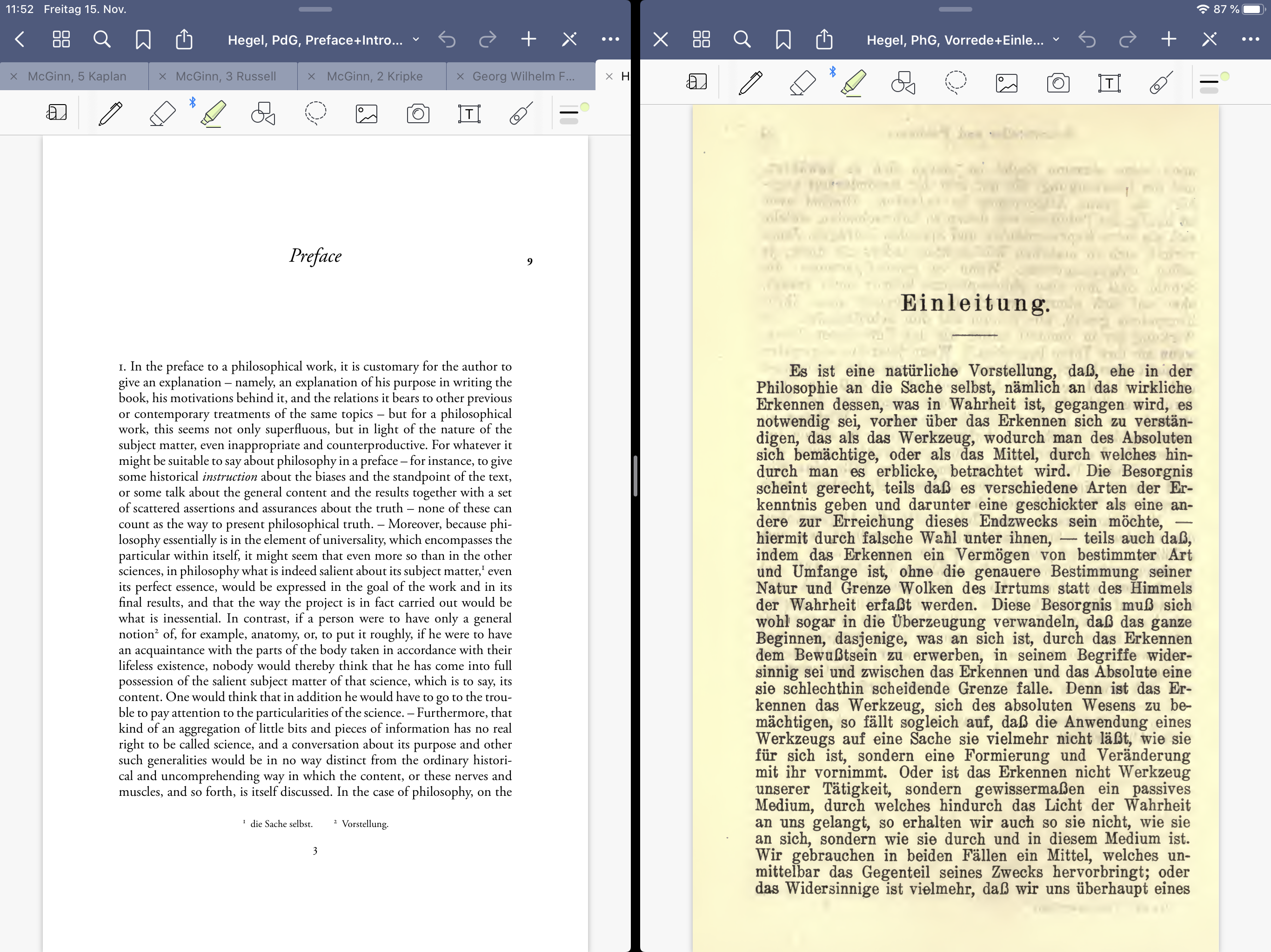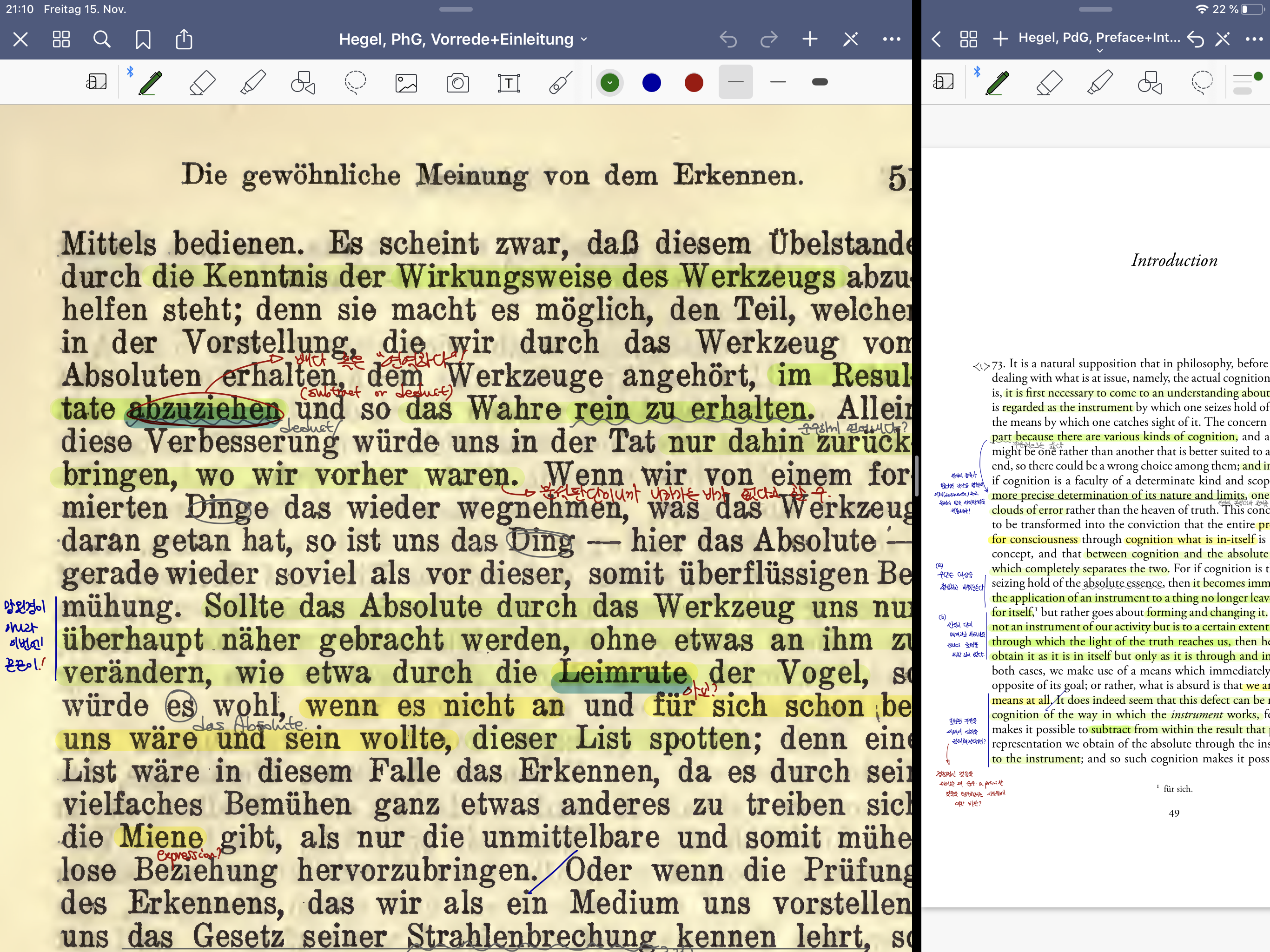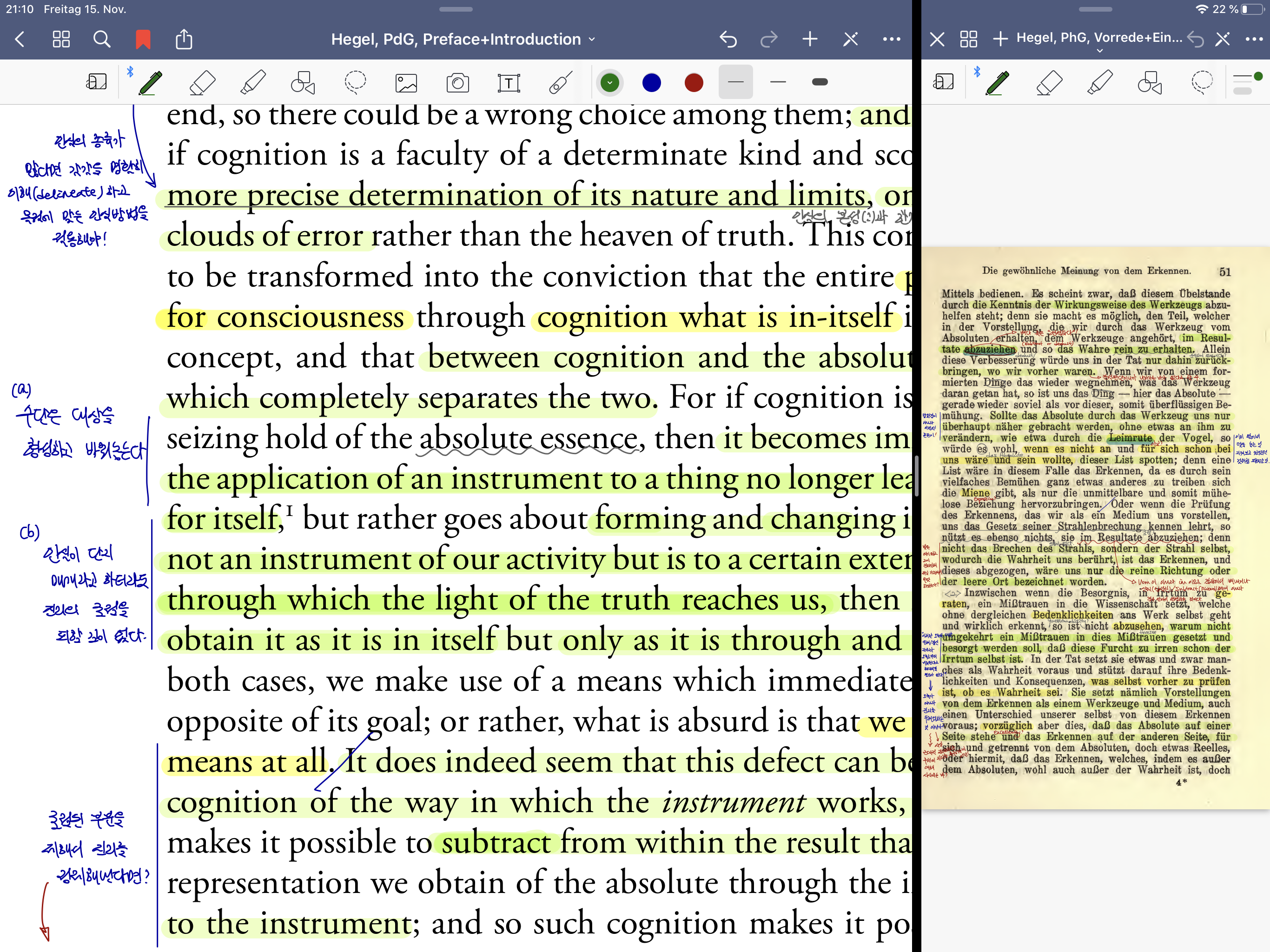 정신현상학 머리말과 서론을 한국어로는 일회독을 끝냈는데, 한국어로만 읽기는 아쉬워서 영어와 독일어로도 읽기 시작했다.
