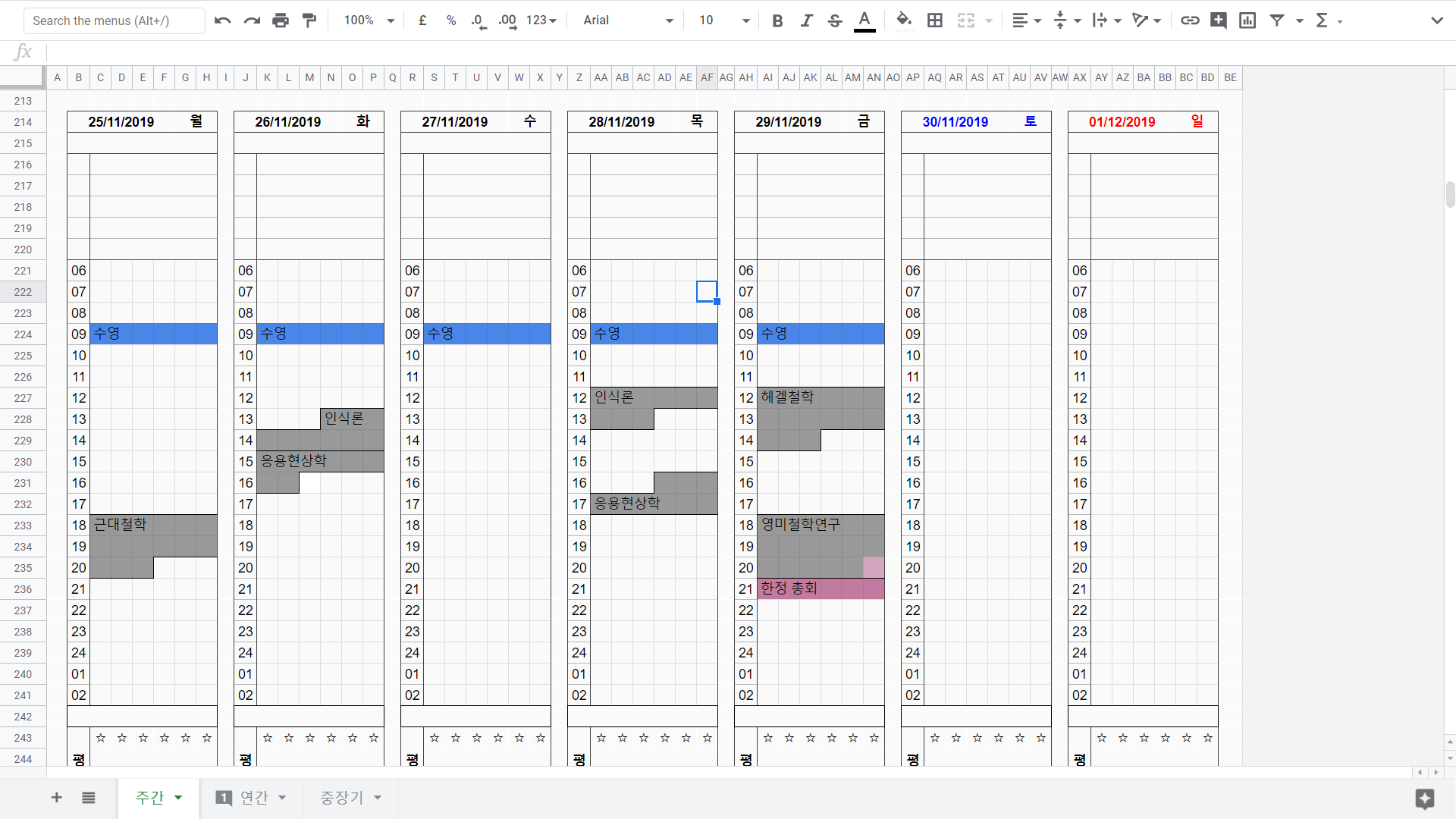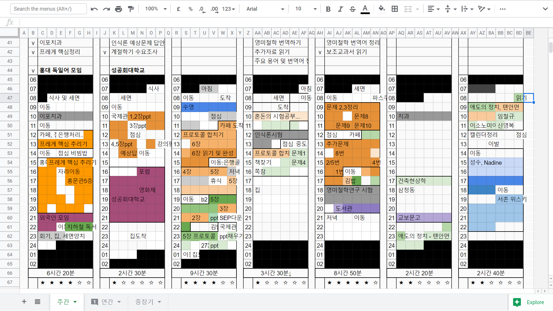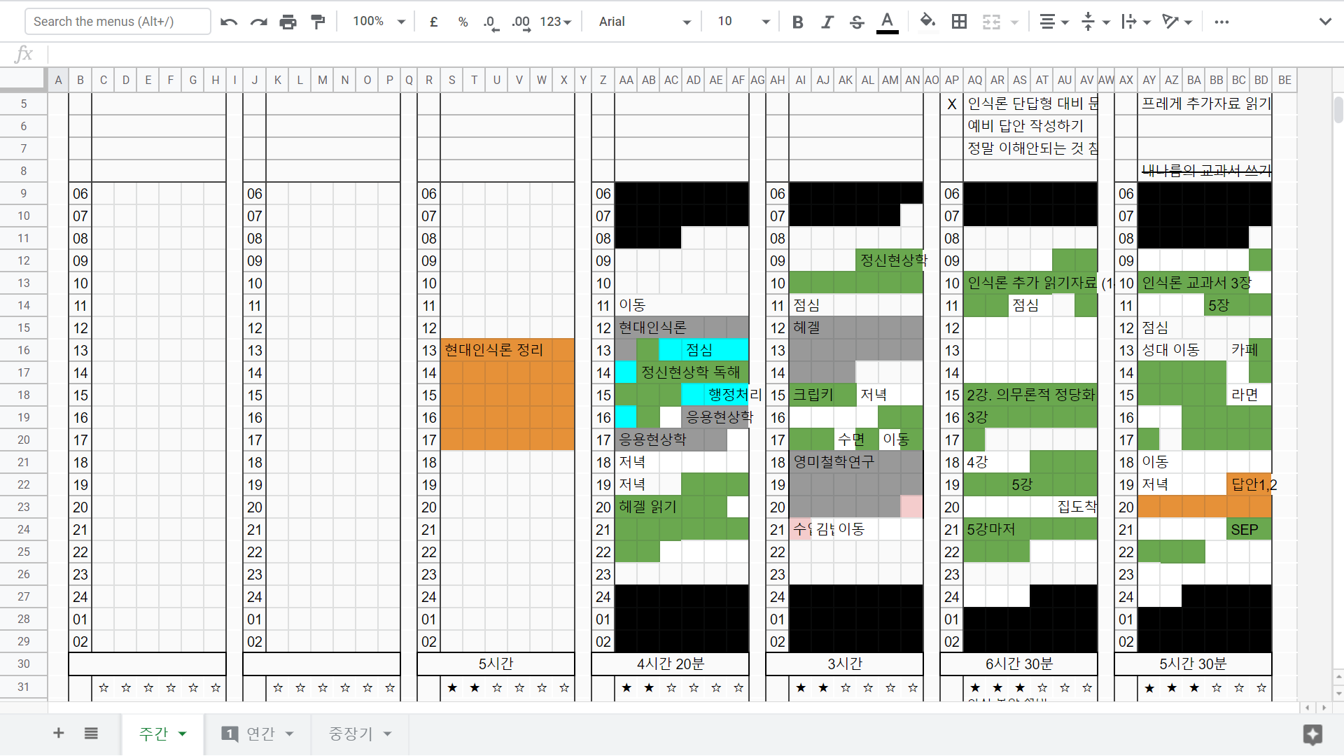 - 수능공부나 고시공부를 하는 사람들이 쓰는 다이어리를 따라서 구글 시트로 일과 기록표를 만들어 보았다.