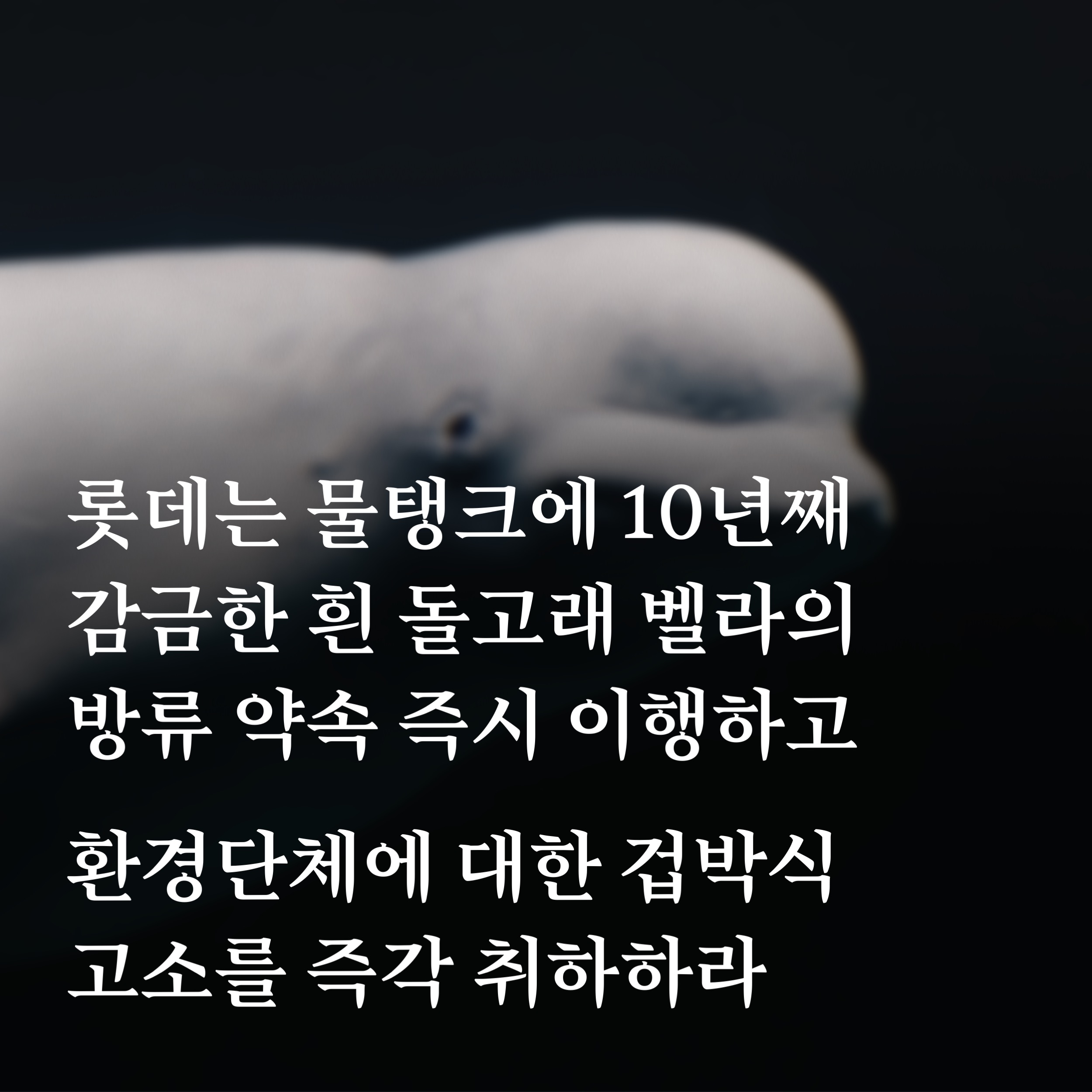 - 롯데는 벨루가 벨라의 방류 결정 발표를 호객성 상술로 이용하지 말고 벨라의 전시를 중단하라.