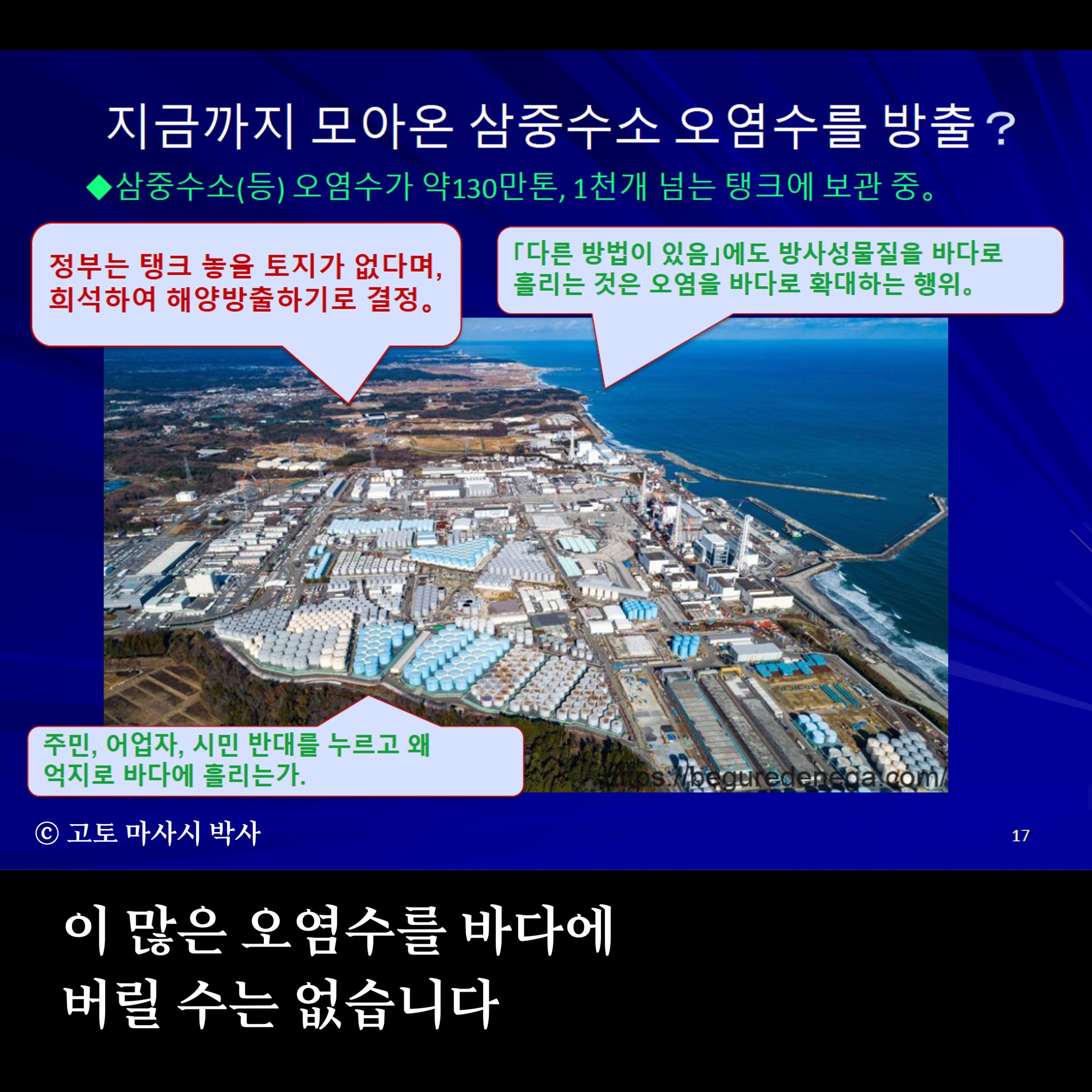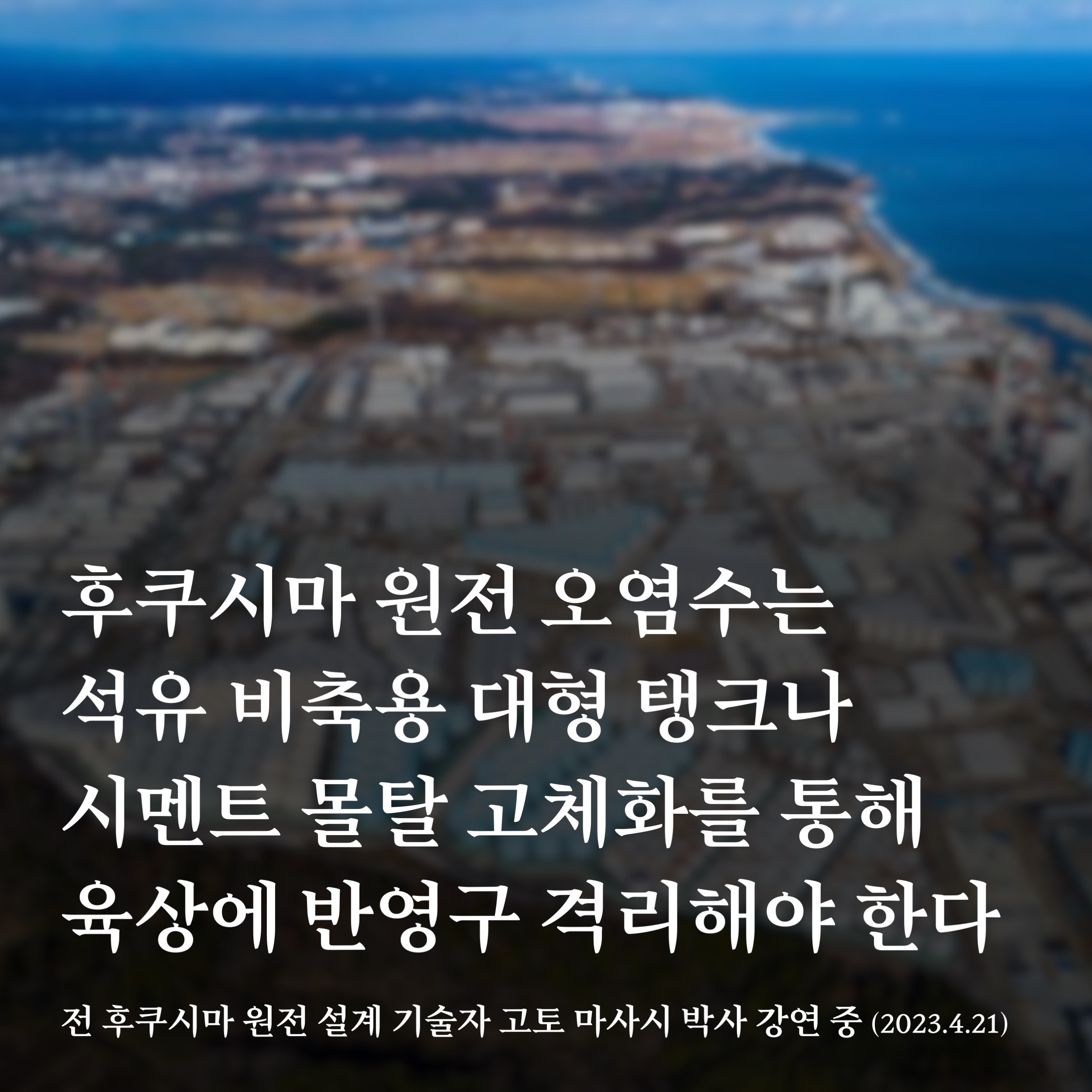 지난 4월 21일, 탈핵시민행동과 환경운동연합의 주최로 열린 고토 마사시 박사의 초청 강연은 후쿠시마 원전 오염수의 처리와 관련하여 요구되는 대안적 상상력을 제공하고 있습니다. 후쿠시마 원전 설계에 실제 참여했던 고토 마사시 박사는 이 강연에서 오염수의 해양 투기는 절대 답이 될 수 없다고 말하며, 해양 투기의 대안을 몇 가지 제시합니다.