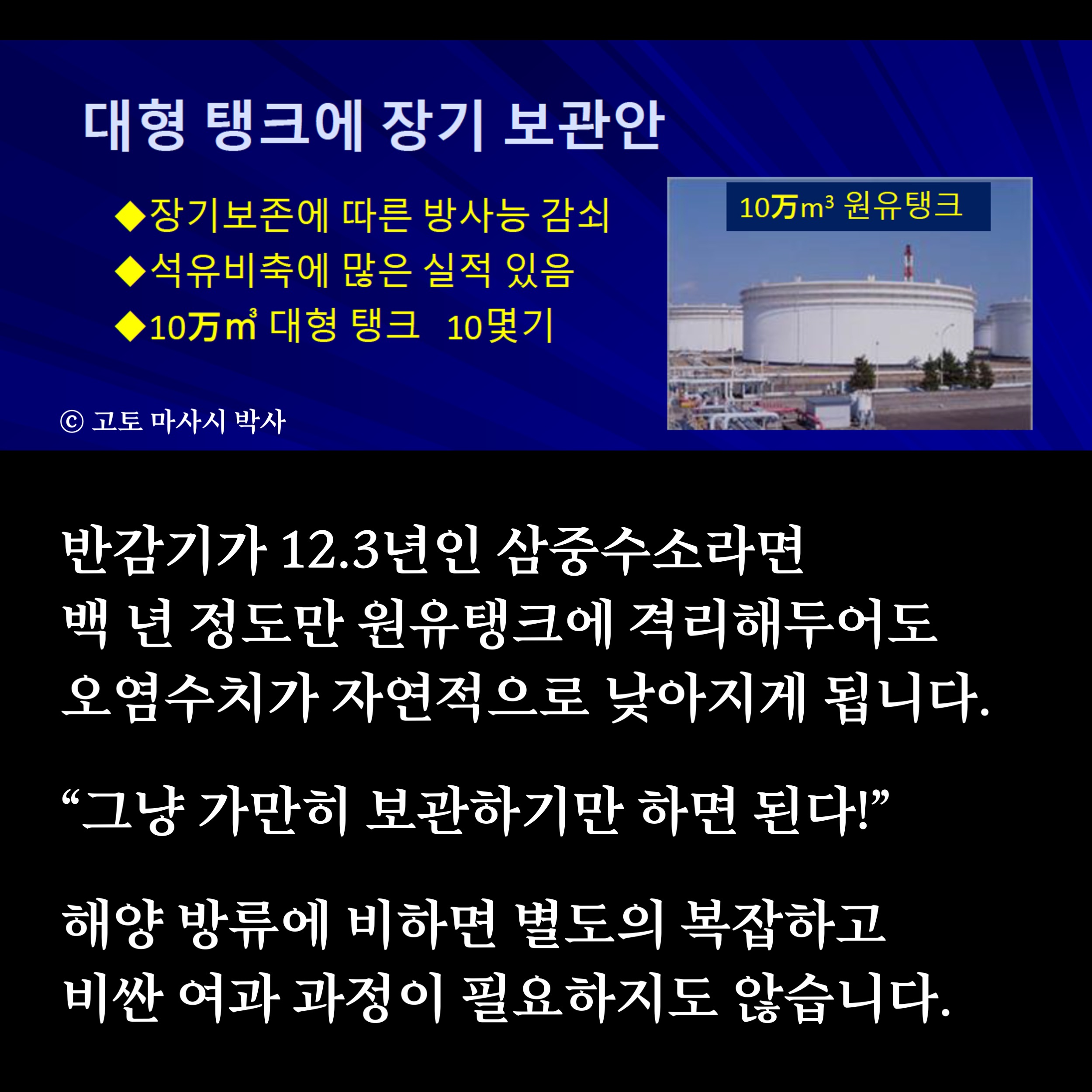 박사가 제시한 첫 번째 대안은 10만 L 크기의 초대형 원유 비축 탱크에 오염수를 옮겨 백 년 동안 보관하는 것입니다. 일본에는 국외에서 원유 공급이 단절되는 상황에 대비해 구축된 원유 비축 시설들이 있는데, 이 안에 오염수를 가둬두고 반감기가 여러 차례 지나 방사성이 붕괴할 때까지 기다리자는 것이 박사의 주장입니다. 반감기가 12.3년인 삼중수소라면 백 년 정도만 격리해두어도 자연스레 수치가 낮아지게 됩니다. 이는 해양 방류에 비하면 별도의 복잡하고 비싼 여과 과정이 필요하지 않으므로 지극히 단순하고 직관적인 방법이 아닐 수 없습니다. 그냥 반감기가 여러 번 지날 때까지 가만히 두기만 하면 됩니다.