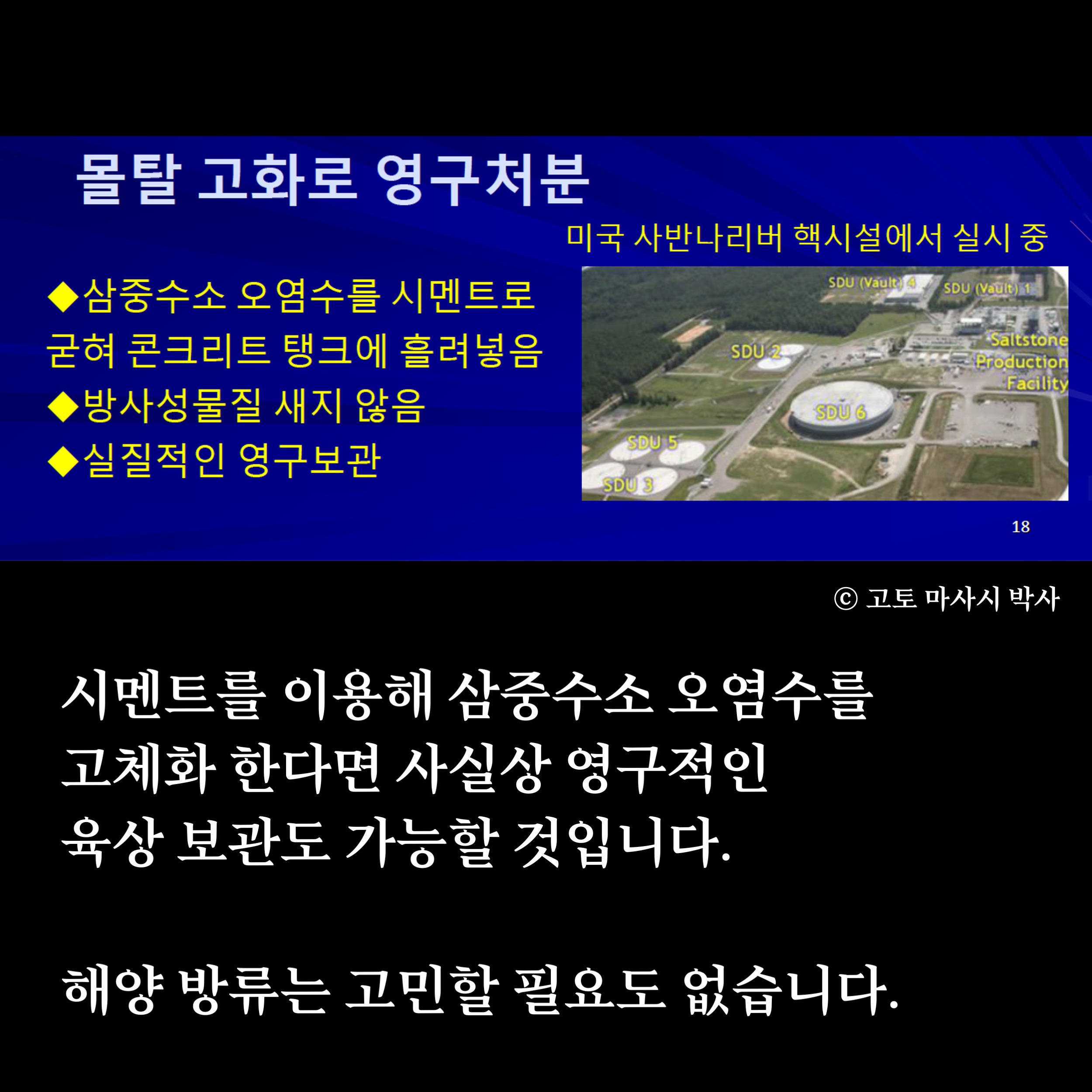 원전 오염수를 처리하기 위해 고토 박사가 제시한 두 번째 대안은 시멘트로 오염수를 굳혀 고체로 만드는 것입니다. 삼중수소는 물과 같은 성질을 가지고 있기 때문에 고체로 굳히면 밖으로 새어나오지 않는다고 합니다. 이렇게 시멘트 몰탈화로 삼중수소를 가둬두는 방식은 이미 미국 사우스캐롤라이나의 사바나리버 핵시설에서도 사용되고 있습니다. 시멘트를 이용한 고체화 방식을 이용할 경우, 방사능 오염수가 사실상 영구적으로 육상에 보관되도록 할 수 있을 것입니다.