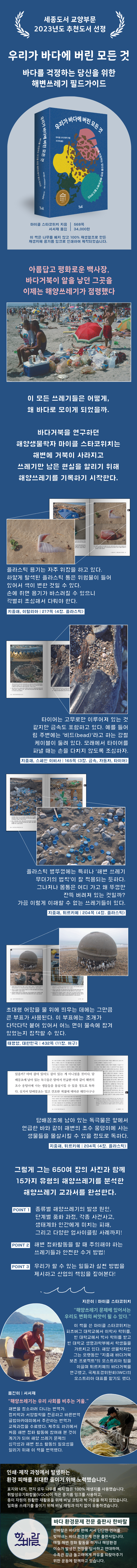 이번에 『우리가 바다에 버린 모든 것』은 맨드라미 디자이너님(@mandramibook)의 작업으로 훨씬 맵시 있고 예쁜 옷을 입게 되었습니다. 568쪽이나 되는 두께에도 내용이 무겁거나 학술적으로 느껴지지 않도록 조금 더 재치있게 다가오도록 하는 데에 초점을 두었습니다. 이 책에는 저자 마이클 스타코위치 교수님의 깨알같은 농담(가끔은 아재 개그..ㅋㅋ)도 많이 있는 만큼 이 책이 여러분들께 조금 더 친근한 인상으로 다가갔으면 하는 바람입니다.