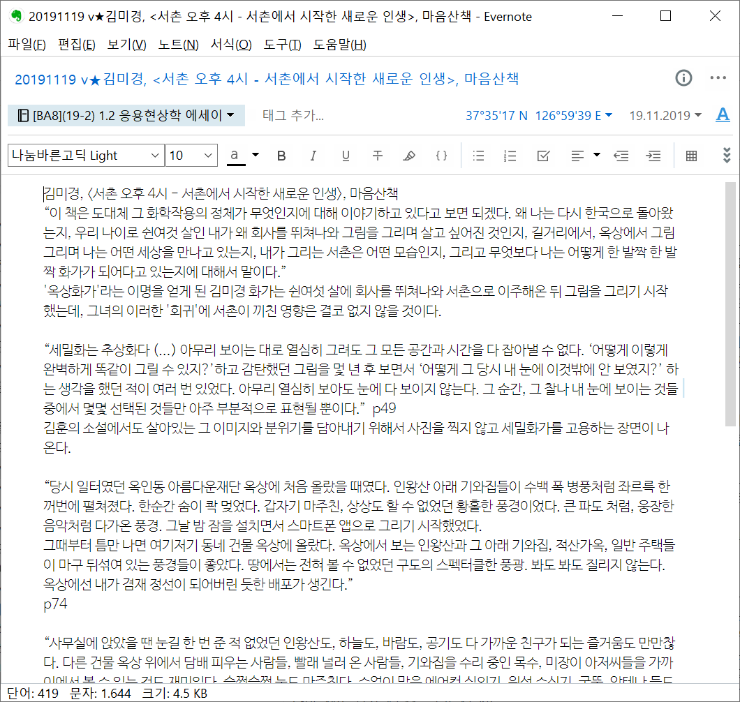 △ 옮겨적을 때에는 무조건 페이지 수부터 먼저 적자. 안그러니까 자꾸 페이지를 누락시키게 되고, 나중에 책상에 책이 없는데 페이지를 몰라서 인용을 못하는 낭패가 생긴다. 그리고 인용문이 여러 페이지에 걸쳐있게 되면 페이지가 바뀔 때마다 인용문 안에 페이지를 표시해주자. (안그러고 마지막에만 'p.p. 72-73' 이런 식으로 적어두니까 나중에 중간에 필요한 부분만 잘라서 쓰게될 때 이게 72부터 시작하는건지 73부터 시작하는건지 헷갈린다.)