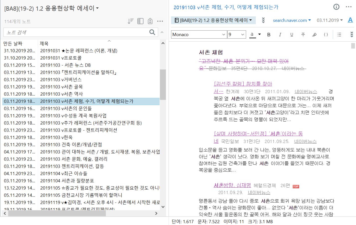 여기서 2차 문헌은 읽기와 발췌/기록을 동시에 할 수 있는 텍스트들은 깊게 이해할 것 없이 그냥 말을 빌려오기만 하면 되는 심도의 텍스트들이다. 이번 글쓰기에서는 딱히 철학적인 관점이나 통찰을 담고있기보다는 통계분석이나 사례연구를 중심으로 하고 있는 건축학회나 주거연구회, 디자인 관련 논문들, 수필이나 수기들이 여기에 해당되었다. 이에 반해 전체적인 관점이나 논지를 배웠던 교수님 저서나 하이데거의 거주 관련 강의록들은 이것들에 비해서 내용이 훨씬 방대하고 이해하기도 어려웠으므로 레퍼런스 카드를 나중에 가서 만들었다. (사실 이번 에세이는 이 일차 문헌들을 완전히 장악하지 못한 채로 쓴 것 같아서 아쉽다.)