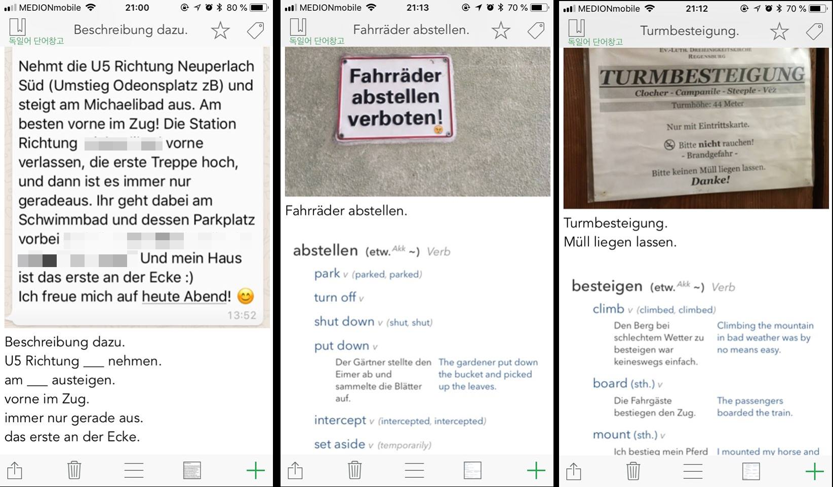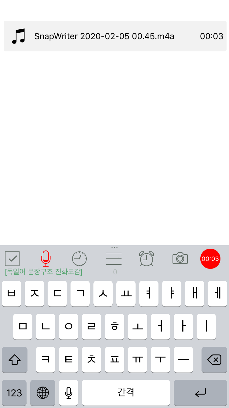 덧3) SnapWriter에는 사진만 추가할 수 있는 게 아니라 녹음도 추가할 수 있다! 원어민과 대화를 할 때 죽어도 안들린다면, 혹은 현지에서 공수한 생생한 어학자료를 만들고 싶다면 이렇게 녹음을 하고 메모를 추가해두는 것도 편리할 것 같다. 나는 뮌헨에서 시위가 있을 때 사람들이 외치는 구호들을 아카이빙하려고 이 기능을 처음 써봤었다. 녹음을 시작할 때는 마이크 아이콘을, 녹음을 끝낼때는 마이크 아이콘이나 타이머가 들어있는 오른쪽의 빨간색 동그라미를 클릭하면 된다. (앱을 처음 다운받았을 때에는 권한설정 때문에 녹음이 안 될수도 있으니 주의!)