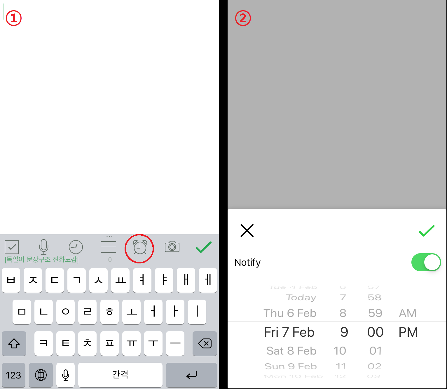 덧2) 만약 추가한 어휘/표현을 어느정도 간격을 두고 나중에 다시 복습하고 싶다면 알람을 설정해 놓을 수도 있다.