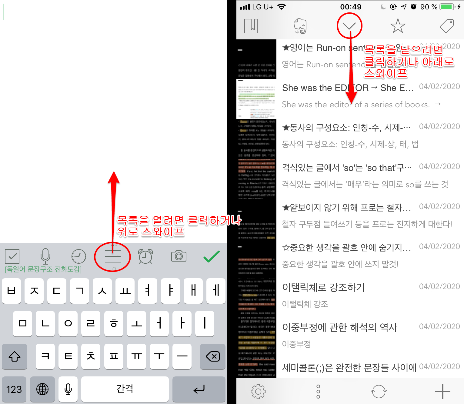 - 사진만 덩그러니 있으면 정확히 어떤 표현을 기록하고 싶은 것인지 분명하지 않고, 나중에 에버노트에서 검색이 안 될 수도 있으므로 불러온 사진 밑에 새로운 표현들을 간단하게 메모해둔다.