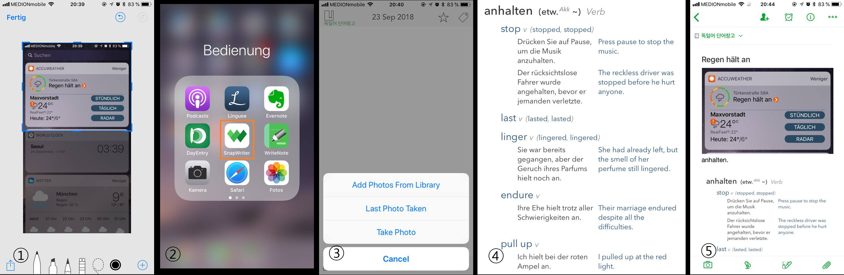 사진②: SnapWriter 앱을 연다. (나는 카메라, 사전앱(Linguee), 에버노트, SnapWriter를 하나의 폴더 안에 같이 넣어서 독에 위치시켰다. 이렇게 하면 홈 버튼을 눌러도 사진②에서 처럼 폴더가 열려있는 상태로 돌아가기 때문에 같은 작업과정에 속해있는 다른 앱으로 비교적 빠르게 이동이 가능하다..)