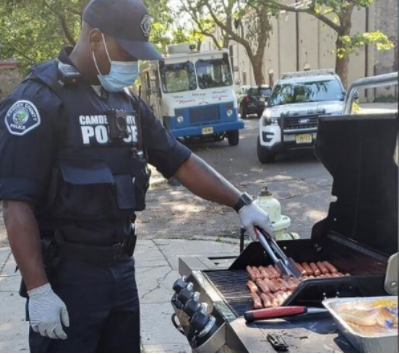주민 바베큐 파티에 참석하여 고기를 굽고 있는 미국 경찰