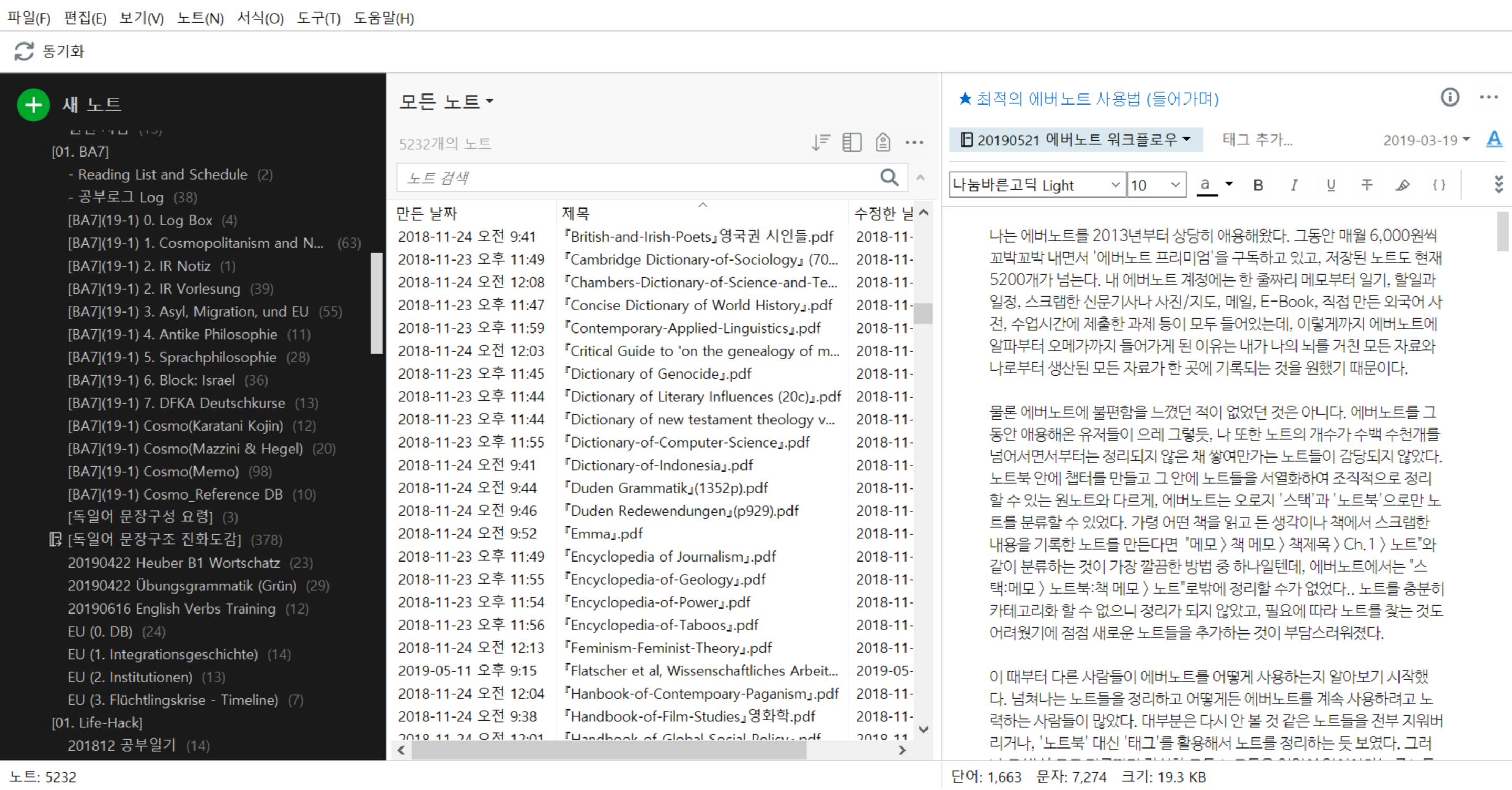 이렇게 의지를 다지며 계속 새로운 방식들을 시도해온지가 벌써 1년 반.. 그동안 많은 사람들이 '에버노트는 불편하다'며 에버노트를 떠났지만, 나는 에버노트로부터 자료를 수집하고 분류하고 가공하고 활용하는 법을 배웠고 여러 시행착오 끝에 결국에는 예전과는 전혀 다른 방식으로 에버노트를 사용하는 법들을 찾았다.