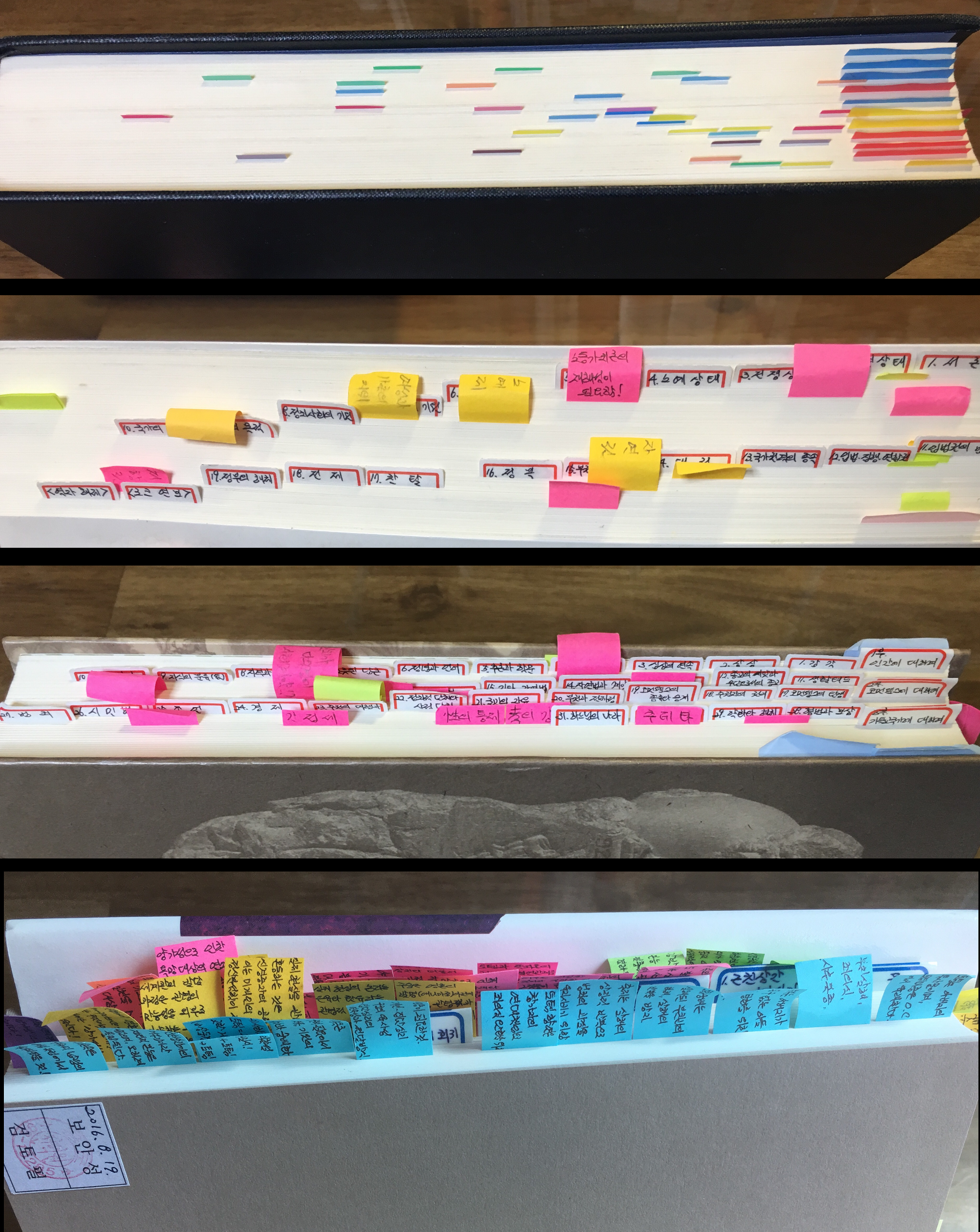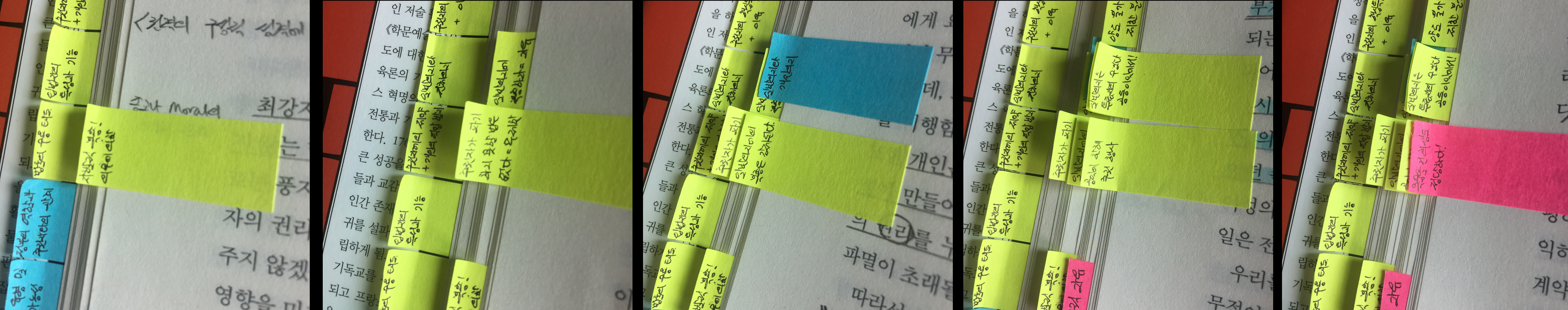 이 때 내용의 유형에 따라 포스트잇 색깔을 달리했습니다. 예를 들면 "이론적인 설명은 파랑, 예시는 노랑, 평범한 것은 초록, 의문사항이나 나중에 따로 검색해봐야할 것은 주황, 매우 중요하거나 개인적으로 영감을 많이 주는 것들은 자홍 ..." 이런식으로요:)