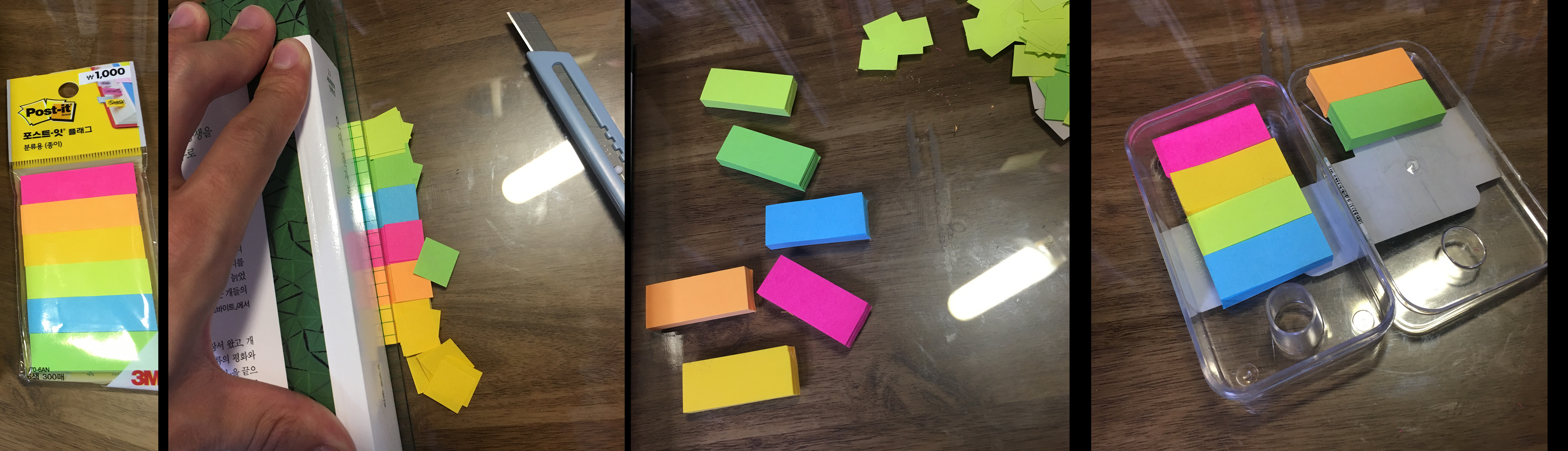 저는 이렇게 정리된 포스트잇을 플라스틱 케이스(클립통 재활용)에 붙여서 항상 가지고 다닙니다:)