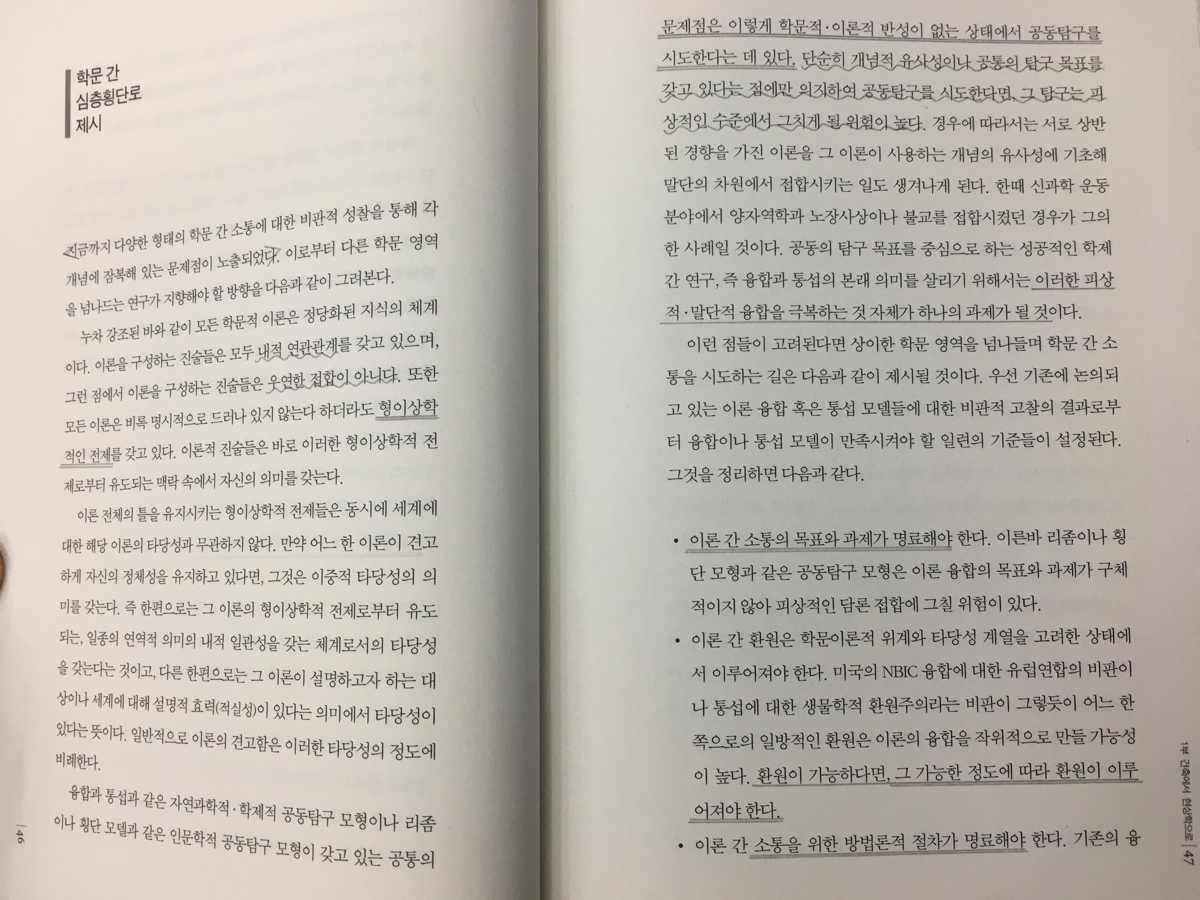 "아울러 각 이론이 전제하고 있는 형이상학적 전제들과 그 전제들로부터 유도되는 이론적 개념들의 심도, 특히 이론 전체의 타당성 계열과 관련된 심도들을 점검함으로써, 단순히 개념적 유사성에 기초한 학문 간의 접속이 아닌, 해당 이론들의 심층으로부터의 소통 가능성을 검토한다. 다음은 이론 간 소통을 위한 심층횡단의 절차들을 구체화한 것이다." (p48)