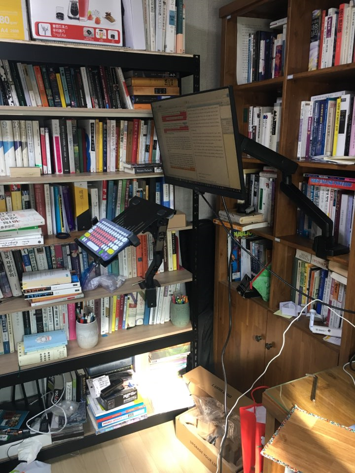 그래서 이번에는 모니터암 두 개를 이용해서 모니터랑 키보드를 책장에 연결해 공중에 띄워보았습니다. (계속 작업 환경을 이리저리 바꾸는 와중이라 방이 몹시 지저분하군요) 이 세팅은 오래가지 못했는데, 키보드를 타이핑 할 때마다 모니터암이 덜렁거려서 작업에 집중할 수 없었기 때문입니다.
