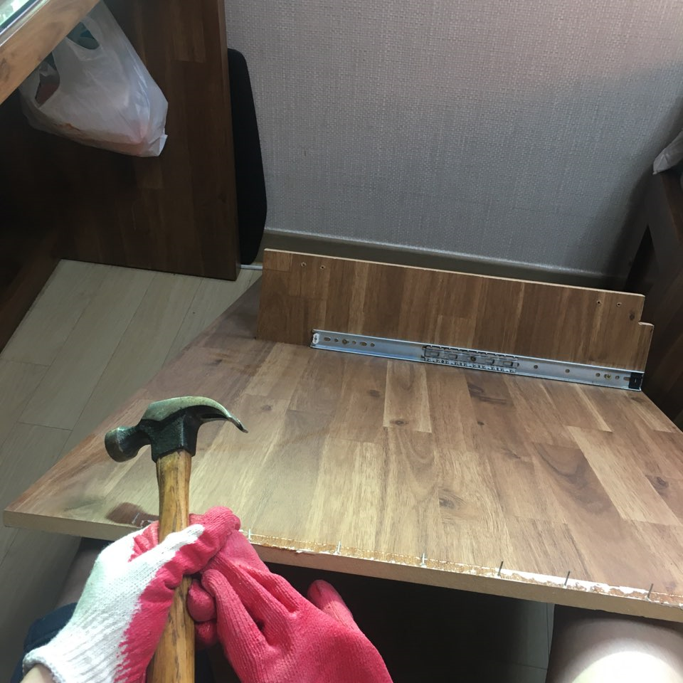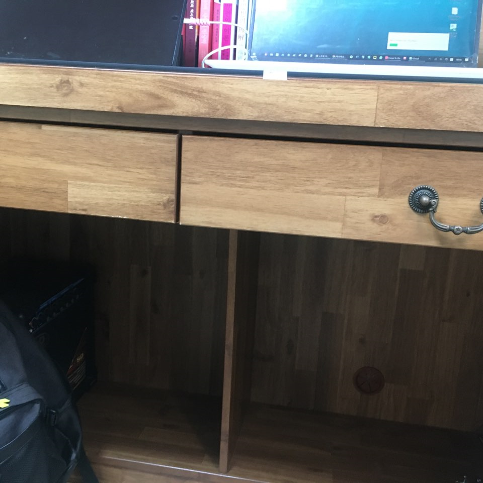 꽤 예쁜 책상이죠? 하지만 이 책상에는 그야말로 치명적인 단점이 있었습니다. 바로 제 키에 비해 높이가 너무 높다는 것이었죠. 팔을 힘을 빼고 적당히 늘어뜨린 상태에서 키보드 타이핑을 하려고 하면 의자의 높이를 최대한으로 높여야 했는데, 그러면 발이 바닥에서 떨어졌습니다. 발이 바닥에서 떨어지니 계속 허리가 긴장하는 상태를 유지하게 되었죠. 더 심각한 점은 책상 서랍이 상판 아래에 있어서 의자를 최대한으로 높이면 무릎이 책상에 눌렸다는 것입니다. 위 사진에는 나오지 않지만, 원래는 서랍이 이렇게 달려 있었습니다(▼).