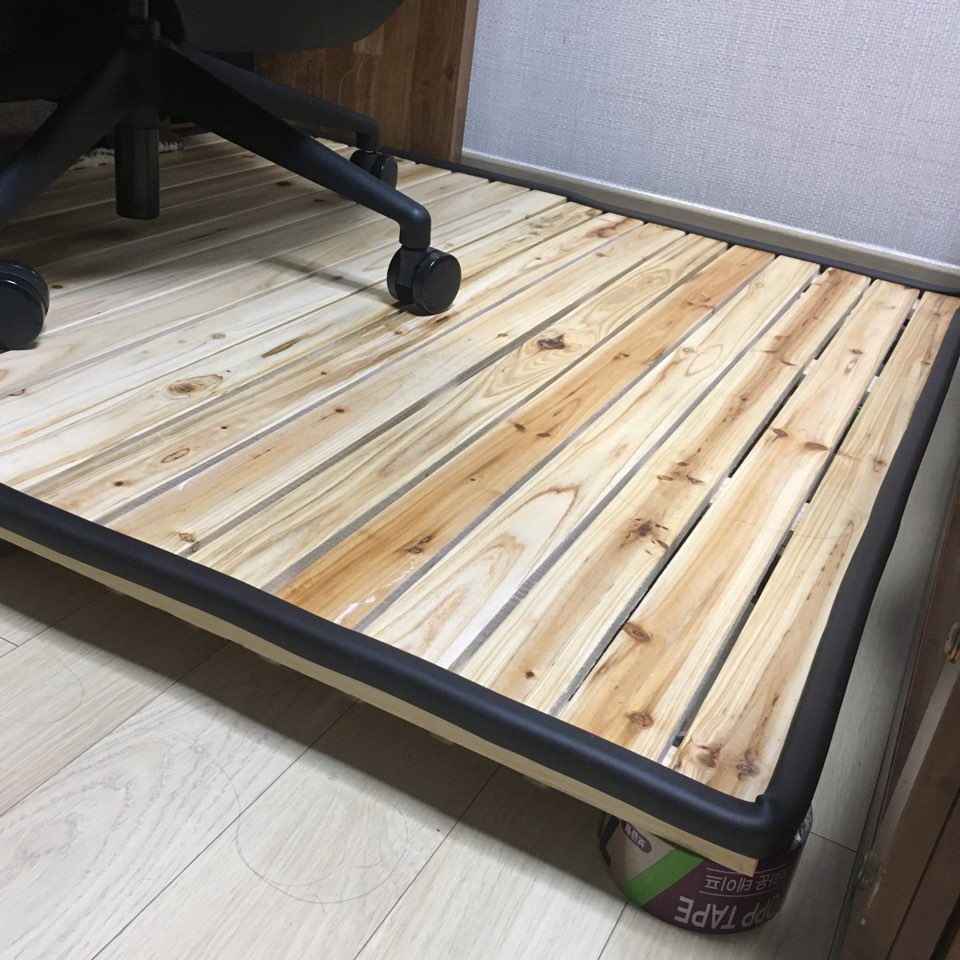 이렇게 서랍을 떼어내고 나니 의자를 조금 더 높여서 타이핑하는 손의 높이를 더 편하게 위치시킬 수 있게 되었습니다. 물론 의자를 더 높일수록 발은 더 바닥에서 떨어지고 말았죠. 그래서 이번에는 바닥을 높이는 작업에 들어갔습니다. 인터넷에서 제일 큰 사이즈의 나무 발판 두 개를 사고, 그 밑에 박스테이프 16개를 깔아 바닥 높이를 10cm가량 높였습니다.