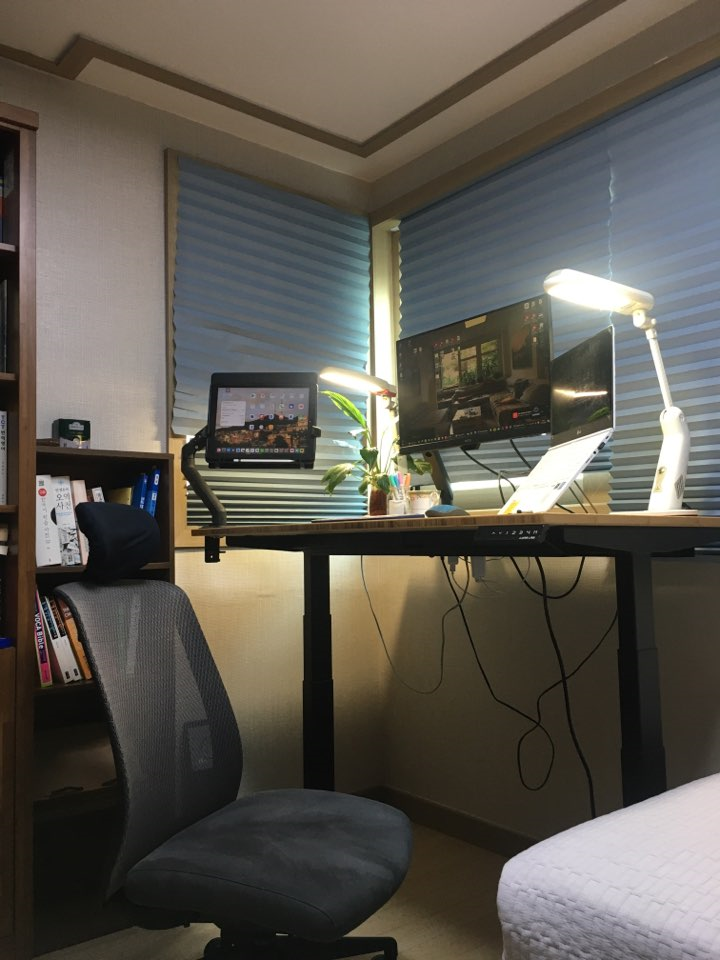 그렇게 하여 제 방에 들어서게 된 데스크의 모습입니다! 원하는 높이를 메모리에 입력해서 버튼 하나만 누르면 미리 입력한 높이로 책상이 움직이는데요, 이 사진은 제가 앉아서 작업할 때 가장 편한 높이(62cm)에서 찍은 사진입니다.