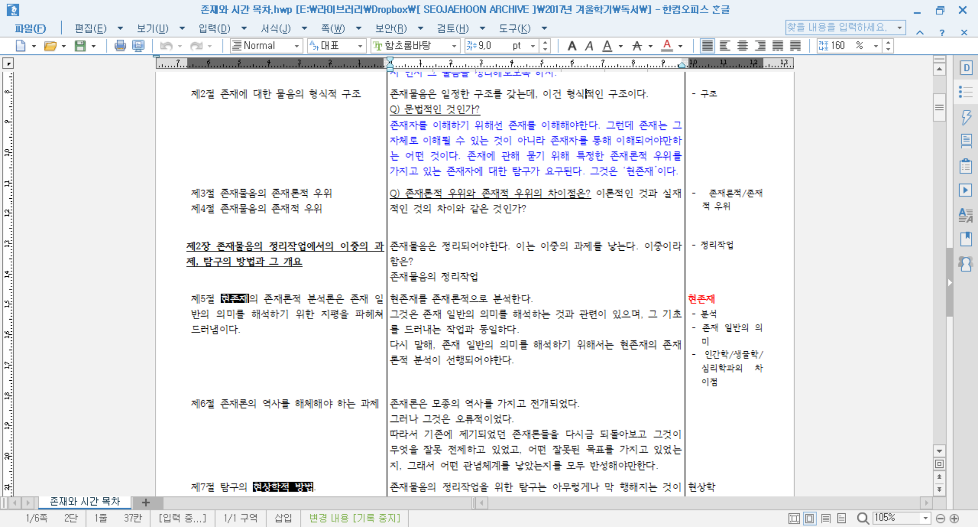 제가 목차를 처음 읽으면서 남겼던 메모들을 날것 그대로 한번 보여드릴까 하는데요, 이번 학기에 듣게 된 '응용 현상학' 수업의 교재 『공간의 현상학, 풍경 그리고 건축』이라는 책의 목차를 읽으면서 에버노트에 정리했던 것을 그대로 가져왔습니다. 약 90분 동안 이렇게 목차를 읽으면서 논지를 추측하고 의문들을 적고, 본문에서 키워드들을 이해하기 위해 몇 페이지를 선별해서 읽는 과정 속에서 꽤 만족스러운 정도까지 책의 요지를 개괄적으로나마 파악해낼 수 있었던 것 같습니다. 500쪽 정도 되는 꽤 두꺼운 책의 요지를 한시간 반만에 추출해내니까 무척 능률적인 독서를 한 기분이네요. (여담이지만 여태까지 전혀 감이 잡히지 않았던 하이데거 철학을 이해할 단초들을 이 책을 통해서 얻게된 것은 어마어마하게 큰 소득이었던 것 같습니다.)
